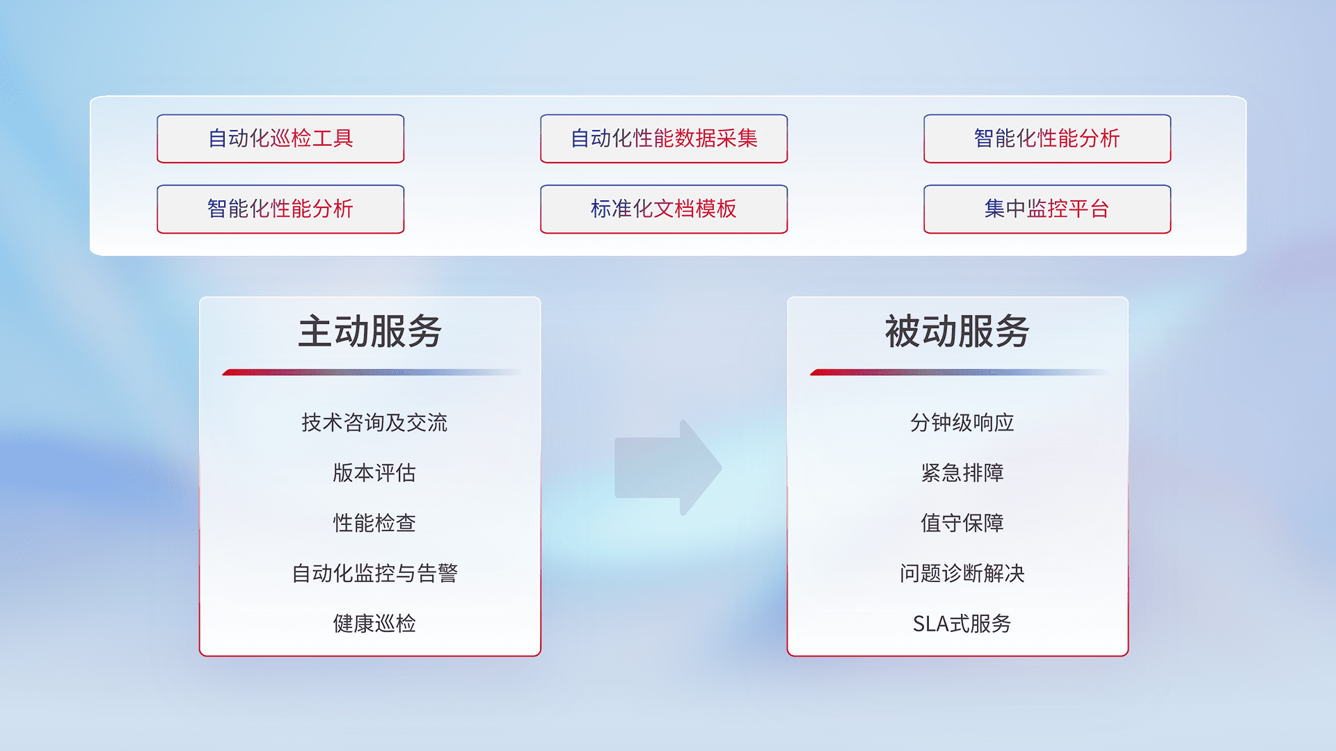 智能化工具和标准化文档,,,保障服务质量,,,提供主动服务(包含技术咨询、、、版本评估、、、性能检查、、自动化监控与告警、、、健康巡检)和被动服务包含(分钟级响应、、、紧急排障、、、、值守保障、、问题诊断解决、、、、SLA服务)。。。。